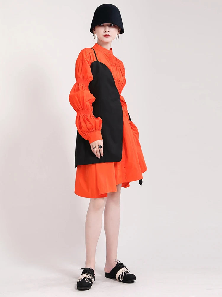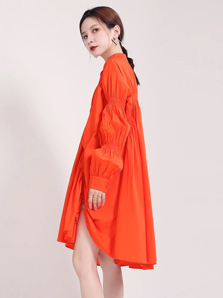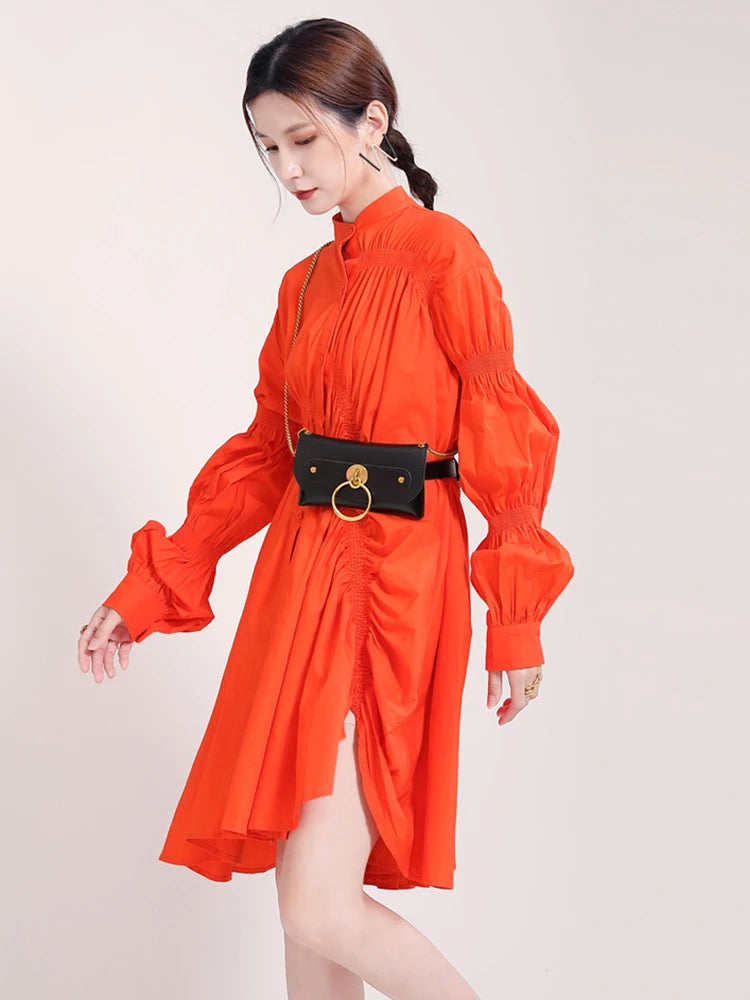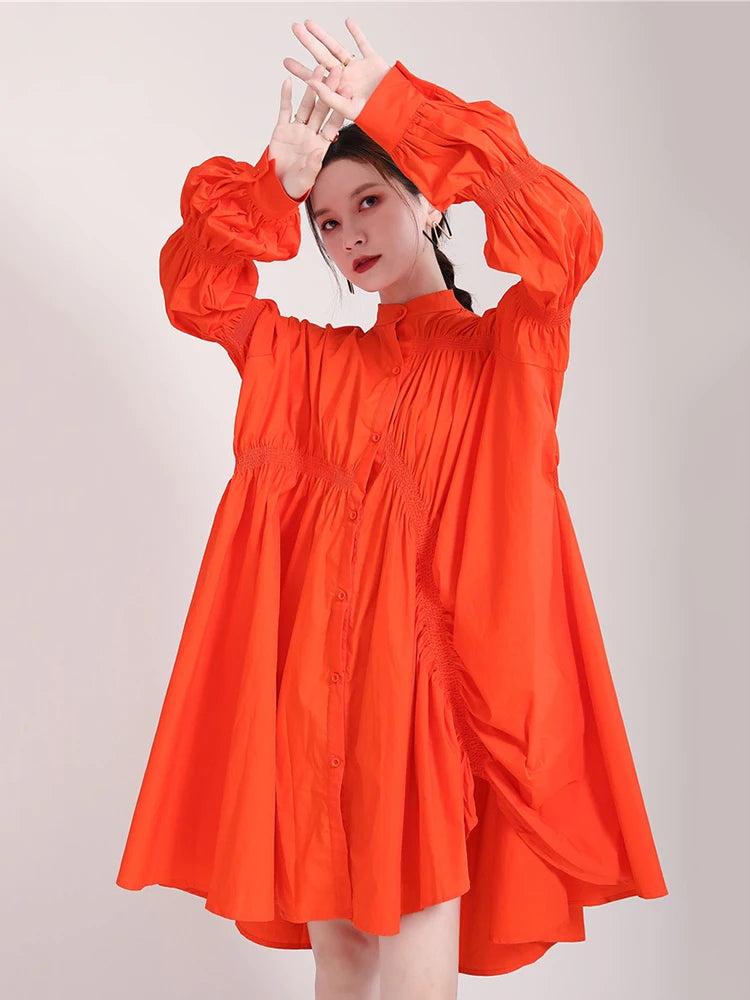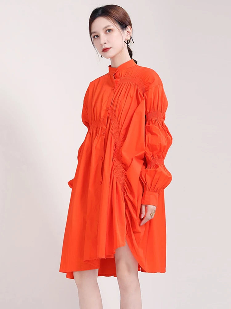 Hotaru Long Sleeve Pleated Shirt Dress - Orange